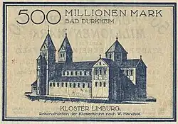Ein Geldschein der Stadt Bad Dürkheim aus dem Jahr 1923 mit dem Inflationswert „500 Millionen Mark“ zeigt eine Rekonstruktionszeichnung der Klosterkirche von Wilhelm Manchot.