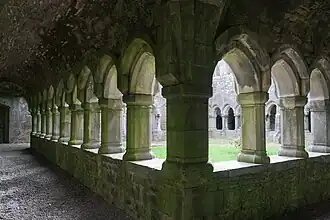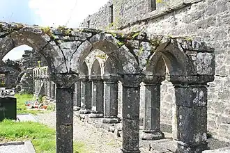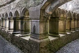 Der nördlich der Kirche liegende Klostergarten hat vier umlaufende Arkaden, davon war die sich an das Kirchenschiff anlehnende Südseite einfach überdacht, die anderen drei sind in die jeweiligen Nebengebäude integriert und mit einem Tonnengewölbe versehen. Harold G. Leask und Roger Stalley sehen die Ähnlichkeit der Arkaden mit denen von Ross Errilly, so dass sie mindestens auf das Ende des 15. Jahrhunderts, möglicherweise auch später geschätzt werden.[64][61] Die Ähnlichkeiten sind so groß, dass davon ausgegangen wird, dass dies Arbeiten der gleichen Steinmetze sind.[64][65] Roger Stalley sieht hier auch genügend Ähnlichkeiten zu den Arkaden in Creevelea:[61]