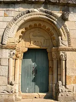 Das Hauptportal ist von fünf Archivolten eingefasst, die auf Säulen mit reich verzierten Kapitellen ruhen. Das Tympanon zeigt die von einem Nimbus umgebene Figur des Christus Pantokrator, die zu beiden Seiten von weiteren Personen flankiert wird. Unter den Füßen der Christusdarstellung zwei weitere Personen, die gemeinhin mit dem Apostel Judas und Arius in Verbindung gebracht werden.