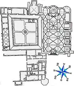 Der untere Teil des Kreuzgangs mit seinen Doppelsäulen und romanischen Blatt- und Figurenkapitellen ist mittelalterlich; der obere wurde im 17. Jahrhundert aufgesetzt. In der Mitte der Hoffläche befindet sich ein zweistöckiges Brunnenbecken; unmittelbar daneben sind die Grundmauern der bei Ausgrabungsarbeiten freigelegten frühchristlichen Kirche mit hufeisenförmiger Apsis sichtbar. Teile der an den Kreuzgang angrenzenden Gebäude sind zu einem Museum umgestaltet worden.