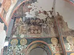 Auf den Innenwänden sind großflächige Fresken aus zwei Phasen erhalten. Die älteren stammen aus der Bauzeit, dem 11. Jahrhundert. Die jüngeren aus dem 14. Jahrhundert sind besser erhalten und zeigen verschiedene Heilige und biblische Szenen. Eine Besonderheit sind die Porträts von Stiftern, die damit zu sehr frühen Individual-Darstellungen zählen.
