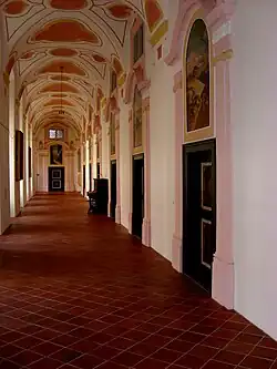 In der repräsentativen Vorhalle des eigentlichen Kirchenraums ist das Gründungsereignis des Klosters an der Decke in Szene gesetzt. Geschaffen wurde dieses Fresko, das sogenannte Stifterbild, nach einer mittelalterlichen Vorlage, die nicht mehr existiert. Flankiert wird die Vorhalle links von der Nepomukkapelle und rechts von der Tauf- oder Silvesterkapelle. Der Innenraum stellt ein Gesamtkunstwerk dar.