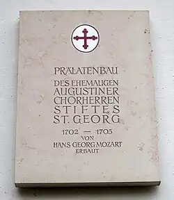 Das spätere Kloster wurde um 1070 durch Bischof Embrico von Augsburg als geistliche Kommunität an einer St. Georg geweihten Kapelle gegründet. 1135 gründeten Bischof Walter I. von Dillingen und das Augsburger Domkapitel hier ein Stift für Augustiner-Chorherren, deren neuerbaute Kirche bereits 1142 geweiht wurde. Das Recht der freien Propstwahl erlangte das Stift Mitte des 12. Jahrhunderts. Die Augustiner-Chorherren übernahmen die Seelsorge der wachsenden Vorstadt westlich des Dombezirks. 1180 bekam St. Georg einen eigenen Pfarrsprengel. Laut Urkunde vom 8. Februar 1197 soll Papst Coelestin III. die Pfarrei St. Georg persönlich gegründet haben. Neben der dem Orden vorbehaltenen Stiftskirche entstand Ende des 13. Jahrhunderts für die Pfarrgemeinde die Kapelle St. Michael.[1] Im Zuge der Befestigungserweiterung wurde das Kloster im 14. Jahrhundert in die Stadtmauer mit einbezogen. 1525 übergab der Rat der Stadt die Kapelle St. Michael der protestantischen Gemeinde als Predigthaus. Nach dem den Katholiken vom Rat der Stadt die Religionsausübung bereits 1534 untersagt wurde, wählten die Chorherren von 1537 bis 1548 Schloss Guggenberg als Exil. Die protestantische Kapelle St. Michael wurde nach dem Wiedererhalt 1630 vom Stift devastiert. 1693 erhielt Propst Leopold Ilsung das Recht der Pontifikalien bzw. das Infulat. Seither war der Vorsteher zum Tragen von Stab und Mitra berechtigt und somit eines der höchsten geistlichen Würdenträger Augsburgs. Von 1680 bis 1705 beauftragte der Propst den Baumeister Johann Georg Mozart mit der Umgestaltung und Erweiterung des Klosters im Stil des Barock. Von 1702 bis 1705 erfolgte nach den Plänen Mozarts die Errichtung eines neuen Prälatenbaues.[2]
