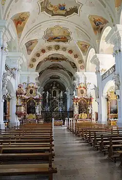 Unter dem baufreudigen Abt Ulrich Bürgi entstand in den 1720er Jahren die heute erhaltene barocke Klosterkirche mit einer Fassade aus rotem Sandstein, die von zwei Zwiebeltürmen flankiert wird. Architekt war Peter Thumb, die reiche barocke Ausstattung stammt unter anderem von Franz Joseph Spiegler (55 Fresken von 1727) und Joseph Anton Feuchtmayer (Skulpturen).