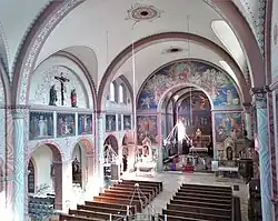 Die Kirche St. Sebastian ist eine dreischiffige Pfeilerbasilika in strengen neuromanischen Formen mit eingezogenem Chor und Dachreiter. Das Kircheninnere ist mit Fresken im Jugendstil geschmückt.