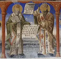 An der Außenmauer der Klosterkirche befanden sich im Jahre 1871 noch die Fresken von den Heiligen Kliment von Ohrid, Naum von Ohrid, Ivan Vladislav, Kyrill und Method, Boris I. von Bulgarien und König Iwan Schischman. Während der serbischen Herrschaft in Vardar-Mazedonien wurden zwischen den Jahren 1913 bis 1941 ein Teil der Fresken samt Inschriften geändert und durch die serbischen Heilige wie Stefan Uroš III. Dečanski und Lazar Hrebeljanović ersetzt.[3]