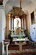 Zur Grundausstattung der Kirche gehört der schlichte Volksaltar, der zentral im Chor steht. Dahinter wurde als Ersatz für das fehlende Altarblatt ein buntes Chormittelfenster angebracht. Es zeigt in hellen Farben die Heiligste Dreifaltigkeit, die durch Jesus, die Taube des Heiligen Geistes und die Hand Gottes repräsentiert wird. Darunter, wesentlich dunkler gehalten, betet der heilige Augustinus inmitten von Weinreben.