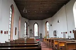 Ein nach Süden versetztes Portal leitet ins Kircheninnere über. Es ist mit dem Wappen der Karmeliter und der Jahreszahl 1702 verziert und wird von einem gesprengten Giebel bekrönt. Schlichte Sandsteingewände umgeben es. Man betritt die Kirche im Erdgeschoss, wo eine Treppe zum 1908 errichteten Obergeschoss mit dem heutigen Gottesdienstraum überleitet. Eine schlichte hölzerne Flachdecke begrenzt den Kirchenraum.[13]