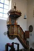 Die meisten Ausstattungsgegenstände wurden nach der Profanierung der Kirche an verschiedene Kirchengemeinden der Umgebung verkauft. Am meisten profitierte davon die kleine Filialkirche St. Andreas in Köhler. Zwei Altäre und die Kanzel aus der Vogelsburg haben sich dort erhalten. Der Hochaltar ist viersäulig und entstand wohl um 1730. Das ursprüngliche Altarbild wurde entfernt. Etwas früher wurde der Seitenaltar mit dem Bild der Anbetung der Maria Neapolitana geschaffen, während die Kanzel dem Spätbarock zuzuordnen ist.[17]