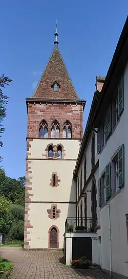 Ursprünglich soll der Glockenturm sieben Glocken gehabt haben, wovon fünf während des 17. und 18. Jahrhunderts durch französische Truppen geraubt worden sein sollen. Eine dieser geraubten Glocken soll ins Straßburger Münster gelangt sein. Die verbliebenen zwei Glocken stammen vom Lörracher Glockengießer Andreas Roost, der sie 1774 herstellte. Die zwei Glocken wurden 1901 abgehängt, so dass heute keine Glocken mehr im Turm hängen.[13]