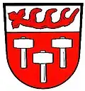 Blasonierung: „Unter silbernem Schildhaupt, darin eine waagerecht liegende rote Hirschstange, in Rot drei (2:1) gestellte silberne Schlägel.“
