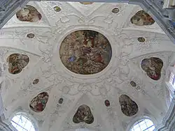 Auf dem Hauptfresko an der Decke der Vierung sind in einem Stuckrahmen in Form einer Vierpass-Variante Christus und die vier Evangelisten mit ihren Symbolen auf Wolken sitzend dargestellt. Acht Engel mit den Arma Christi umgeben das Bild. In Stuckkartuschen, die seitlich an den Vierungsbögen angebracht sind, sieht man die vier Kirchenväter.