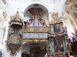 In den Nischen beidseits des gegenüberliegenden Chorbogens befinden sich zwei weitere Emporen mit Orgeln. Rechts über dem Kreuzabnahmealtar steht die Epistelorgel mit 16 Registern, 1743 von Joseph und Victor Ferdinand Bossart erbaut. Im selben Jahr erbauten Vater und Sohn Bossart auch die Evangelienorgel mit acht Registern. Beide Orgeln sind von der äusseren Erscheinung her fast spiegelbildlich, die Unterschiede sind marginal.[43] Hinzu kommen zwei transportable Kleinorgeln im Chor, ein Positiv und ein Regal. Dabei handelt es sich um originalgetreue Nachbildungen zweier Kleinorgeln aus dem 17. und 18. Jahrhundert, die 1992 von Bernhardt Edskes anfertigte.[44]