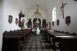 Das breite Langhaus und der eingezogene Chor mit einem geraden Schluss haben Stichkappentonnengewölbe. Ostseitig am Langhaus zum Innenhof des Klosters besteht eine Seitenkapelle als Loretokapelle. Die Eingangshalle zum Kloster bergseitig am Chorhaupt trägt den Dachreiter zur Klosterkirche.