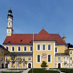 Nördlich an den Chor ist eine zweigeschossige Sakristei angebaut. An der Südseite der Kirche sind zu beiden Seiten des Querschiffs schmale, zweigeschossige Gebäudeflügel angefügt, die im Erdgeschoss jeweils eine Vorhalle zur Kirche enthalten. Deren Zugänge werden von einer Portalarchitektur umrahmt, die aus Putz modelliert ist: je zwei toskanische Pilaster tragen einen Architrav; darüber sind Giebelstücke angeordnet. Nach Westen hin befindet sich in diesem Gebäudeflügel die Preysing-Kapelle.[5]