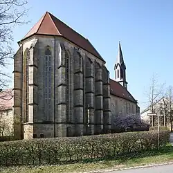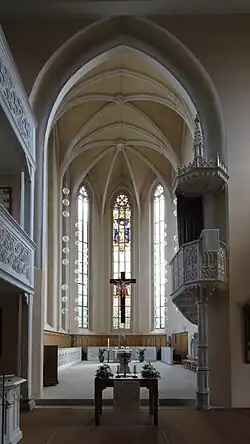 Der schlanke, polygonale Langchor hat drei Joche und schließt mit fünf Seiten des Achtecks. Ein Fensterbankgesims ist umlaufend. Die hohen, spitzbogigen Maßwerkfenster sind bis auf das dreibahnige, farbige Ostfenster, zweibahnig ausgeführt. Die Strebepfeiler zwischen Fenstern sind durch drei zusätzliche Gesimse und kleine Giebel sowie Fialen gegliedert. Vier Kreuzgewölbe mit Birnstabrippen überspannen den rund 18,5 Meter hohen, 9,4 Meter breiten und etwa 18 Meter langen Innenraum.[5] Die beiden ersten Schlusssteine der Gewölbe zeigen einen Christuskopf und ein Gotteslamm. Das zweigeschossige Dach mit jeweils zweifach stehendem Stuhl stammt wohl aus dem 14. Jahrhundert. In der Südseite steht ein Treppenturm, im halben Achteck hervortretend und mit einer Treppenspindel, der das Dachtragwerk erschließt. Der Turmzugang befindet sich in etwa drei Meter Höhe und wurde vermutlich über den nicht mehr vorhandenen Kreuzgang erschlossen.[1] Unter dem letzten Fenster der Nordseite ist eine Eingangstür vorhanden. Ein Giebel schließt die Westseite hoch über dem First des Langhauses ab. Darunter trennt ein tiefer, spitzbogiger Triumphbogen den Chor vom Langhaus.