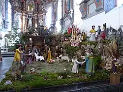 Vor der Renovierung der Krippe 1985 wurde sie in der seitlichen Antoniuskapelle als Wechselkrippe aufgebaut. Inzwischen werden die Engel, die hl. Familie, die Hirten mit ihren Frauen, die Könige mit ihren Dienern und die Tiere gleichzeitig im Chorraum der Kirche aufgestellt.