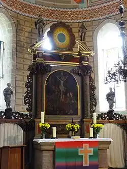Die mittelalterlichen Altarblöcke in der Hauptapsis sowie in der äußeren nördlichen Nebenkapelle sowie am zweiten nordwestlichen Langhauspfeiler stammen aus der Bauzeit der Kirche. Der Altaraufsatz in der Hauptapsis besteht aus Backstein und stammt vermutlich aus dem Jahr 1703. Die Predella zeigt das Abendmahl Jesu, das darüber befindliche Gemälde die Kreuzigung Christi. Es wird von zwei Palmsäulen mit Akanthuswangen umrahmt. Darüber befindet sich ein gesprengter Segmentgiebel mit dem Gottesnamen JHWH in hebräischer Schrift auf einem blauen Kreis, umgeben von einem Strahlenkranz, und zwei Engeln.