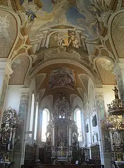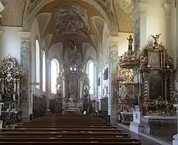 Das Innere wird trotz der Rokoko-Dekoration durch das klare, für die 1630er Jahre fortschrittliche Raumschema geprägt. Das Langhaus mit vier Achsen ist als Wandpfeilerkirche mit mäßig tiefen Nischen gebildet. Der zweiachsige Chor endet in einem dreiseitigen Schluss. Stichkappentonnengewölbe von gemeinsamer Scheitelhöhe schließen den Raum ab. Durch die regelmäßige Folge hoher Rundbogenfenster wird eine helle Beleuchtung erreicht. Ursprünglich war der Raum vermutlich durch kassettenartigen, zurückhaltenden Rahmenstuck geschmückt, der im Jahr 1750 zur Schaffung glatter Malflächen beseitigt wurde. Auch die Wölbung wurde verändert. Die in das Langhaustonnengewölbe einschneidenden, sphärisch verzogenen Quergurte der Pfeilerzwischenräume sind durch die Räume von Johann Michael Fischer wie etwa in Kloster Osterhofen und Kloster Fürstenzell beeinflusst. Die Pfeiler sind auf der Stirnseite mit Gebälkstücken versehen, im Chor sind flache Lisenen angeordnet. Trotz der sehr einfachen architektonischen Gliederung wird eine prachtvolle Wirkung der Kirche durch die Fresken mit dekorativer Malerei und Umrahmung erreicht, die auch auf die Pfeiler und Wände mit Zierpilastern und schmuckreichen Fensterumrahmungen übergreift. Dem Renaissanceraum im Rokokoschmuck fügen sich die Altäre in regelmäßiger Folge von der Bauzeit bis zum späten 18. Jahrhundert ein.