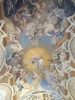 Die Deckengemälde wurden nach einer Signatur im Schiff unten rechts von Franz Anton Rauscher ausgeführt. Das Erstlingswerk des damals zwanzigjährigen Malers ist von starker dekorativer Wirkung. Entsprechend dem Namen der Kirche wird das Erlösungswerk Christi behandelt. Im Chor ist der gefangene Christus vor dem Kreuz an der Treppe eines Palastes dargestellt. Das Fresko im Schiff erstreckt sich über die gesamte Fläche des Gewölbes bis zum Einschnitt der Quergurte. Im Osten ist die Vertreibung aus dem Paradies dargestellt, das als prunkvolle Portalarchitektur im Rokokostil gezeigt wird, aus der das Sonnenlicht erstrahlt. Westlich davon besiegt der heilige Michael den Drachen und die ihm folgenden Engel. In der Mitte ist vor einer goldenen Sonnengloriole die heilige Dreifaltigkeit gezeigt, seitlich davon die Figuren von Ecclesia und Synagoge. Die Gemälde sind in Goldbrokat eingebunden, welche die Restflächen überziehen, die Stichkappen und die Quergurte über den Fenstern sind heller gemustert. In den längsrechteckigen Rahmen des Langhausfreskos greifen lebhaft gekurvte Bänder mit Rocaillewerk ein, die Weißstuck imitieren. Die Bänder wachsen aus vasenförmigen Kartuschen hervor, die über den Gebälkstücken der Pfeiler stehen. Auf den Brokaten der Quergurte sind in heller Grisaillemalerei Kirchenväter und Evangelisten dargestellt. Das Gold und das abgeschattete Weiß dieser Dekoration werden im Fresko als bestimmende Tonwerte aufgenommen. Davon hebt sich die strahlend weiße Tunika Christi ab.