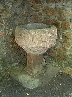 Ein 1483 für die Kirche von Jugenheim angeschaffter Taufstein steht heute geschützt durch eine kleine Überdachung in der Südwestecke der Klosterruine.[48] Das achtseitige Becken stammt aus dem 15. Jahrhundert. Der rote Odenwälder Sandstein trägt auf dem Außenrand drei figürliche Darstellungen: den Gerichtsengel, Maria und einen Mann mit breitem Mantelkragen. Alles ist mit Rankenwerk umgeben.[45] Pfarrer Westernacher stellte den zu diesem Zeitpunkt als Ententrog im Hof des damaligen Pfarrhauses dienenden Taufstein 1831 der Großherzogin Wilhelmine zur Verfügung. Eine Abbildung der Klosterruine von etwa 1836 zeigt diesen im Inneren der Kirchenruine, wenn auch an anderer Stelle als heute.[49]