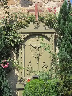 Der Prozessionsaltar aus Sandstein besteht aus einem flachen, einen Meter hohen Sockel mit Inschrift sowie einem 1,50 Meter hohen retabelähnlichem Reliefaufsatz mit einer Kreuzigungsdarstellung in neugotischem Rahmen. Die Kreuzigungsdarstellung zeigt den gekreuzigten Jesus Christus mit den Nebenfiguren Maria und Johannes. Der Sockel hat eine Tiefe von 36 bis 40 cm.