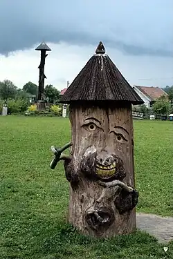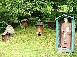 Klotzbeuten und rechts ein Bildstock in Polen