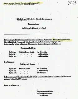 - ↑ a b c Königliche Generaldirektion der Sächsischen Staatseisenbahnen: Bekanntmachung zur Königlich Sächsischen Staatseisenbahn die Haltestelle Klotzsche betreffend. Auszug aus dem Dresdner Journal vom 29. August 1875. Dresden 1875.