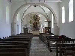 Das Erdgeschoss des Turmes ist mit einem Kreuzgewölbe versehen. Der Kirchenraum selber ist flachgedeckt. Die Wände sind verputzt und schmucklos. Im alten romanischen Teil wurde 1935 die einfache Holzdecke durch eine Stuckbalkendecke ersetzt.