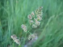 Im rispigen Blütenstand stehen die Ährchen am Ende der Seitenäste geknäuelt-gehäuft. Die Äste sind abstehend bis aufrecht, gelappt und leicht einseitswendig. Die Ährchen enthalten zwei bis sechs Blüten, die alle zwittrig sind. Die Ährchen sind 4 bis 8 mm lang, seitlich zusammengedrückt und von grünlicher bis violetter Farbe. Die Ährenachse ist kahl bis sehr kurz behaart. Die zwei Hüllspelzen sind gekielt, kürzer als das Ährchen und ungleich: die untere ist einnervig, die obere dreinervig sowie länger und breiter als die untere. Die Deckspelzen sind fünfnervig, gekielt und tragen eine Stachelspitze oder kurze Granne. Sie sind etwa so lang wie die obere Hüllspelze und häutig. Die Vorspelzen sind zweinervig, zarthäutig und kürzer als die Deckspelzen. Es gibt drei Staubblätter. Der Fruchtknoten ist kahl und trägt zwei kurze, endständige Griffel mit kurzfedrigen Narben.