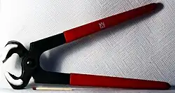 Die Kneifzange dient zum Herausziehen von Nägeln und zum Abkneifen von Draht oder dünnen Metallstiften.[1] Sie ist aus Werkzeugstahl gefertigt und eine der ältesten Zangenformen überhaupt. Je nach Größe und Form des Zangenkopfes lassen sich mit einer rollenden Hebelbewegung Nägel und Krampen aus festem Untergrund herausziehen.