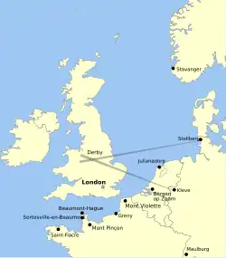 | K10 | 30 | Sortosville-en-Beaumont | F | 49° 25′ 5,8″ N, 1° 42′ 32,6″ W | 25 km süd-südwestlich von Cherbourg |