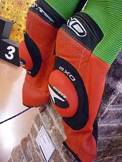 Knieschleifer sind etwa handflächengroß und bestehen meist aus Kunststoff. Sie werden mit einem Klettverschluss im seitlichen Kniebereich der Lederkombi befestigt.