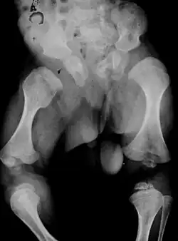 Große Epiphysen und spätes Auftreten des Oberschenkelkopfes im 2. bis 3. Lebensjahr sind weitere Kriterien[2], sowie Megaepiphysen im Knie- und Hüftgelenk.[6]