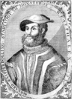 - ↑ a b Vgl.: Jürgen Kehrer: Glauben und Politik am Beispiel der Wiedertäufer in Münster (Seite nicht mehr abrufbar, festgestellt im April 2019. Suche in Webarchiven) Info: Der Link wurde automatisch als defekt markiert. Bitte prüfe den Link gemäß Anleitung und entferne dann diesen Hinweis.. Literarische Kanzelrede in der Stadtkirche Unna vom 20. September 2009. Auf: Website des Evangelischen Kirchenkreises Unna; PDF, 70 kB; abgerufen am 24. Mai 2012.