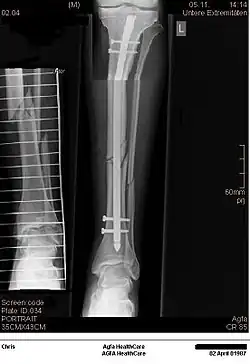 Bei der Verplattung wird eine Platte nach offener Reposition der Fraktur als Fixierung aufgeschraubt und erfüllt damit das Prinzip einer extramedullären Schienung, vergleichbar einem Gips, nur eben direkt am Knochen. Dabei muss die Platte dem Knochen aufliegen, ein minimalinvasives Einbringen ist daher kaum möglich. Auf beiden Seiten des Bruches sollten mindestens drei Schrauben bikortikal, also durch den gesamten Knochen hindurch, verankert werden. Konventionelle Platten gewährleisten bestenfalls eine übungsstabile Versorgung. Durch die Kompression der Knochenhaut ist zudem die Blutversorgung eingeschränkt, was durch „Locking-compression-Plates“ (LCP) verbessert wird. Neuere Platten, sogenannte „dynamic compression plates“ (LC-DCP), ermöglichen Interfragmentäre Kompression durch oval konfigurierte Schraubenlöcher und konische Schraubenköpfe, die beim Anziehen die Platte und das bereits verschraubte Fragment gegen das andere Fragment ziehen. Häufige Anwendung finden anatomisch vorgeformte Platten noch bei der operativen Versorgung der distalen Radiusfraktur und anderer Unterarmfrakturen, bei kindlichen Femurfrakturen sowie in Kombination mit anderen Prinzipien z. B. bei der Versorgung der Sprunggelenkfrakturen. In vielen Bereichen wurden die Platten von überlegenen Verfahren wie den Marknägeln und dem Fixateuer interne abgelöst.[22]