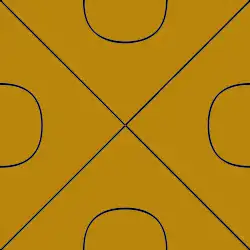 Für die Funktion , dargestellt im Wertebereich , sind z. B. die Koordinatenachsen ebenfalls Knotenlinien, da sie die Bedingung erfüllen. Alle Knotenlinien dieser Funktion bilden ein quadratisches Gitter mit einer Gitterschrittweite von . Die Flächen gleichen Vorzeichens sind Quadrate und bilden ein Schachbrettmuster. Obwohl die Knotenlinien dieses Gitters recht trivial erscheinen, gehören sie dennoch zu dem Funktionstyp, auf den vielgestaltige Eigenfunktionen des (kontinuierlichen) Eigenwertproblems in zwei Dimensionen bei quadratischen, rechteckigen und dreieckigen Scheiben, Platten oder Membranen zurückgehen.
