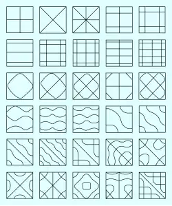 Bekannt geworden sind sie in der Experimentalphysik durch die Chladnischen Klangfiguren. Gezeichnete Knotenlinien wurden erstmals von Chladni im Jahr 1787 veröffentlicht,[3] der auch den naheliegenden Namen Knotenlinien prägte.[4] Grafik 1[5] zeigt Knotenlinien in bekannter Art, wie sie Chladni experimentell ermittelt und gezeichnet hat.