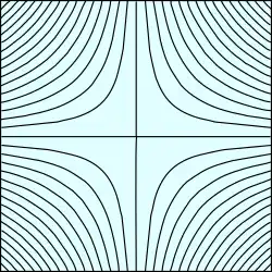 In der linken Grafik sind die Knotenlinien der einfachen Funktion dargestellt, und zwar im Wertebereich der unabhängigen Variablen . Die Knotenlinien bilden die Punkte, die die Bedingung erfüllen. Zwei der Knotenlinien dieser Funktion sind die beiden Koordinatenachsen, sind folglich Geraden, die anderen sind hyperbelartig.