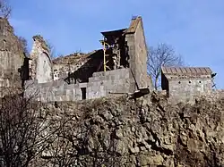 Das steil nach Osten abfallende Gelände ist im Süden durch eine Felskante an der zum Wasserfall führenden Schlucht begrenzt. Die Klosteranlage war von einer Festungsmauer aus Basaltquadern umgeben, deren Reste in der Nordostecke erhalten sind. Der ehemalige Hauptzugang in der Nordmauer besteht aus einem Tunnelgang, der an der Außenseite von zwei Rundtürmen flankiert wird. Der einstige Weg und die Mauern in diesem Bereich sind von Bäumen überwachsen. Der heutige Aufstiegspfad führt direkt zur Hauptkirche im Süden.