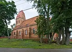 Eine erste Kirche wurde an der Wende des 14. zum 15. Jahrhundert in Stolzhagen gebaut.[6] Sie drohte wohl 1565 einzustürzen, wurde erweitert und am 4. September 1580 durch Bischof Martin Cromer neu geweiht. Nach einer Zerstörung durch einen Brand wurde das Gotteshaus wieder aufgebaut. Am 11. Mai 1608 empfing es seine Weihe durch Bischof Simon Rudnicki. 1911 musste die Kirche abgerissen werden. Sie wurde 1918 durch einen Neubau in neugotischem Stil ersetzt: eine dreischiffige Basilika mit Chor und Kreuzrippengewölbe. Der Hochaltar stammt aus dem 17. Jahrhundert, die beiden Seitenaltäre entstanden um 1700.