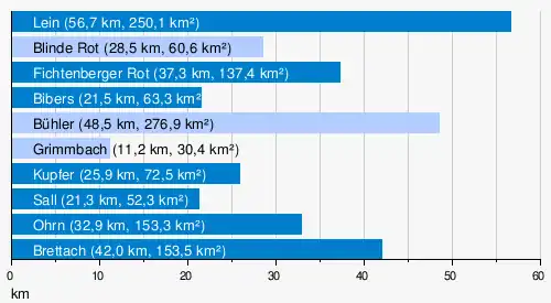 Zuflüsse der Kochers mit einer Länge von 10 km und mehr. Talabwärts geordnet mit Längen und Einzugsgebieten, die rechten Zuflüsse in hellem, die linken in dunklem Blau.