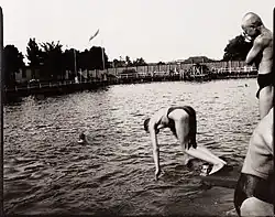 - Im vorderen Bereich für Männer gab es eine 100-Meter-Schwimmbahn mit zwei Nichtschwimmerbecken.[3] Darin wurden die Deutschen Schwimmmeisterschaften 1890, 1896, 1900 und 1905 ausgetragen.[3][6] Der Charlottenburger Walter Brack schwamm dort am 20. Juni 1904 einen Weltrekord über 100 m Rücken in 1:29,0 Minuten.[7]