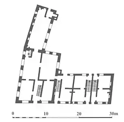 Die Grundrisse der Bauwerksteile wurden den vorhandenen Straßenführungen angepasst und weisen deshalb auch Knicke auf. Der Architekt hat diesen Umstand genutzt, um auch bauliche Unterschiede zu erzeugen, sowohl von der Höhe der Flügel als auch von der Form der Fenster und der Form der Eingänge; meist kamen Rundfenster und Rundportale zum Einsatz. Die Dächer sind ziegelgedeckte Walmdächer, an den Stoß- bzw. Knickstellen entstanden als trennende Schmuckelemente abgetreppte Ziergiebel.[1] (Aus anderen Orten im späten Mittelalter ist überliefert, dass die Anzahl der Treppen an den Giebeln nach außen den Reichtum des Bauherrn repräsentierte – je mehr Treppen, desto reicher.)
