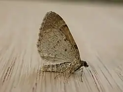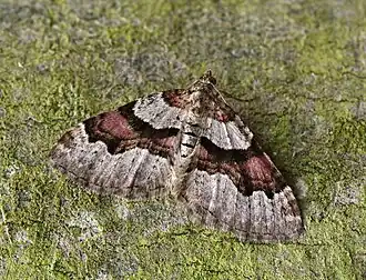 Die Flügelspannweite der Falter beträgt 20 bis 24 Millimeter. Die Vorderflügeloberseite zeigt bei beiden Geschlechtern eine aschgraue bis braungraue Farbe. Das Wurzel- sowie das Mittelfeld sind violett rot, weinrot oder nussbraun gefärbt. Das gezackte Mittelfeld wird wurzelwärts von einer schmalen schwarzen Binde und saumwärts von einer schwarzen Querlinie begrenzt. Am Vorderrand hebt sich nahe der Flügelspitze ein dunkler Fleck ab. Die hell graubraun gefärbte Hinterflügeloberseite zeigt undeutliche dunkle Querlinien. Die Flügelunterseiten sind bei beiden Geschlechtern bis auf kleine schwarze Mittelpunkte und schwache Querlinien zeichnungsarm.