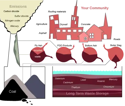 Kohlekraftwerke stehen auch wegen ihres Schadstoffausstoßes in der Kritik. Auch nach dem Einbau von Elektrofiltern und Abgaswäschern in den 1980er Jahren, die den Großteil der Stäube und des Schwefels entfernen, stoßen Kohlekraftwerke relevante Mengen gesundheitsschädlicher Feinstäube, Schwefeldioxid, verbrennungsbedingte Stickstoffoxide und PAK sowie mit der Kohle eingetragene Schwermetalle aus. Schwermetalle liegen im Fall von Quecksilber gasförmig im Abgas vor; andere Schwermetalle wie die krebserzeugenden Stoffe Blei, Cadmium und Nickel sind im Feinstaub enthalten. Luftseitige Grenzwerte sind in der 13. BImSchV festgelegt, Abwassereinleitungen im Anhang 47 der Abwasserverordnung.[31][32]