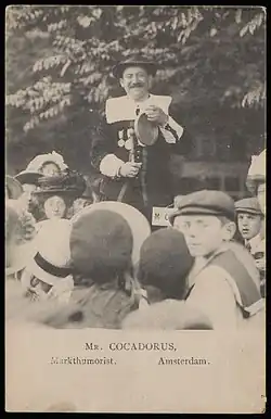 “Op den hoek van Prinsen- en Reguliersgracht troont hij op zijn kar, als ware hij de koning van ’t geheele Amstelveld! Ziet hem daar staan met zijn guitig gezicht, zijn gullen lach, zijn frissche bolle wangen, het roode mutsje op zijn zwart-kroezig haar! Hoort hem spreken, hoort hem zingen! Met zijn oolijke stem, zijn vloed van woorden, zijn leuke moppen, dringt hij een ieder tot luisteren. Zoo één, dan bezit Kokadorus het talent koopman te zijn. In zijn soort is hij een genie.”