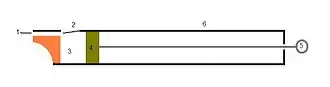 Kolbenflöte im Schnitt:1-Luftspalt; 2-Labium; 3-Resonanzraum; 4-beweglicher Kolben; 5-Zugstab; 6-Rohr