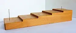 | Abb. 4b: Etikettentreppe aus Buchenholz; drückt man eine Nadel mit Etikett an der Spitze in ein Loch, das sich jeweils in der Mitte jeder Stufe befindet, dann werden die Etiketten bis zur Stufenhöhe hochgeschoben | |