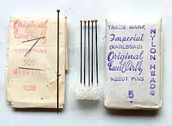 | Abb. 4c: Insektennadeln, links 3 Minutien, Mitte Stärke 1–5, dazwischen große Nadel | Abb. 4d: Mit Minutie auf Insektenplättchen genadelter Käfer |